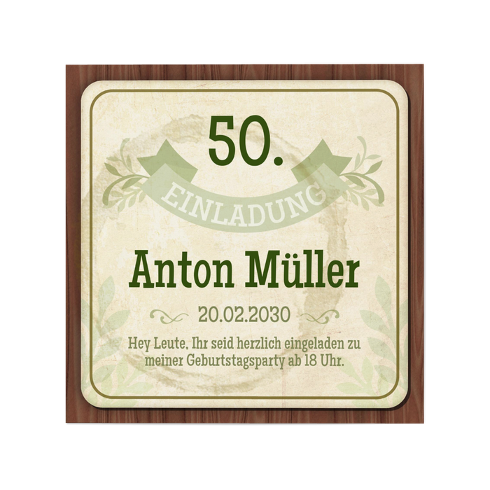 Prost auf den 50. Geburtstag! Unsere Geburtstagseinladung 'Bierdeckel in Grün' lädt zur eine fröhliche Feier eines halben Jahrhunderts ein. Stoßen Sie auf viele weitere Jahre an!