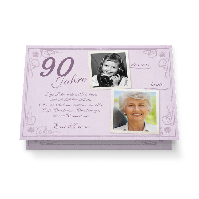 Es ist so weit: Sie feiern demnächst Ihren 90. Geburtstag! Die Geburtstagseinladung "Vintage" in Lila hilft Ihnen dabei, Ihre Geburtstagsgäste auf elegant verspielte Weise mit einem Hauch von Vintage an Ihr Fest einzuladen. Fügen Sie per Mausklick Ihre Bilder hinzu und begeistern Sie die Empfänger!