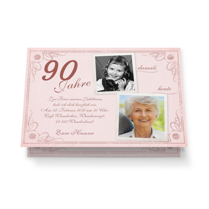 Sie feiern bald Ihren 90. Geburtstag? Die Geburtstagseinladung "Vintage" in Rosé erreicht Ihre Geburtstagsgäste auf elegant verspielte Weise mit einem Hauch von Vintage. Fügen Sie per Mausklick Ihre Bilder hinzu und begeistern Sie die Empfänger!