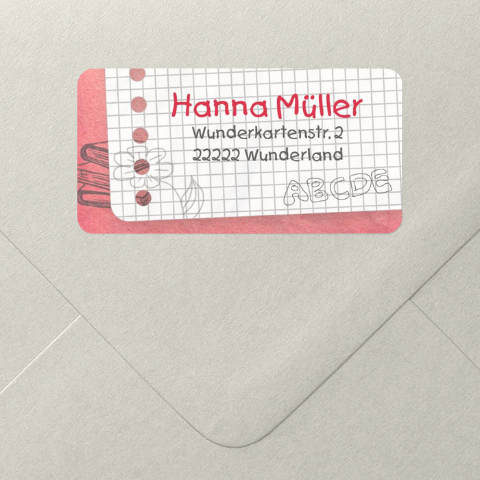 Zur Einschulung gehören auch die passenden Karten. Um sich viel Zeit und Mühe zu ersparen, kann man diese mit Adressaufklebern versehen. Der kreative Aufkleber mit dem passenden karierten Hintergrund und den skizzierten Schulbüchern passt optimal zur Einschulung. Das zarte Rot des Adressaufklebers bietet sich vor allem für die Einschulung eines Mädchens an.