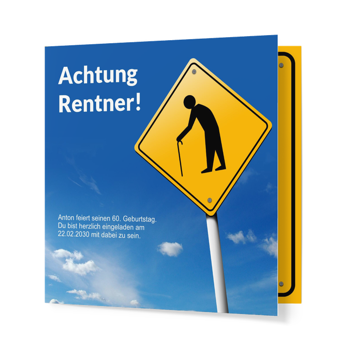 Dieses witzige Schild, dass vor einem, die Straße passierenden Rentner samt Krückstock warnt, eignet sich hervorragend, um Ihre Gäste zu Ihrer Party einzuladen und um den Geburtstag würdig zu feiern. Die Karte besticht durch ihre lustige Aufmachung und lässt die Empfänger Ihrer Einladung schon vor der eigentlichen Sause schmunzeln.