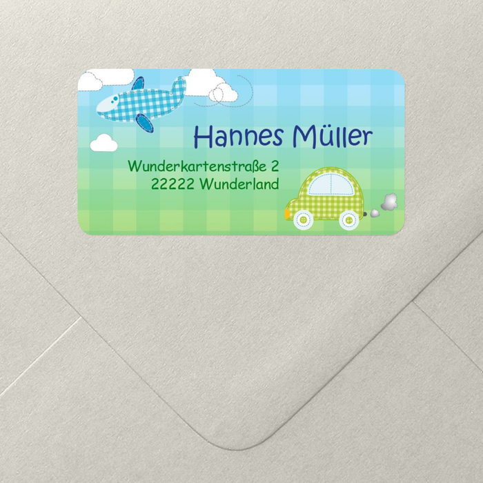 Ein kariertes Auto und ein kariertes Flugzeug ziehen die Aufmerksamkeit sofort auf diesen niedlichen Adressaufkleber, der die Einladungen zum Geburtstag Ihres Sohnes wunderbar abrundet.