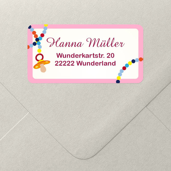 Dieser süße Adressaufkleber ist bewusst in einem sehr kindlichen Lay-Out gehalten und suggeriert dem Empfänger schon beim Empfang des Briefes, dass es sich um die langersehnte frohe Kunde von dert Geburt Ihres Babys handeln wird. Das rosane Lay-Out eigent sich hervorragend um schon vor dem Öffnen des Briefes auf die Geburt einer süßen Tochter hinzuweisen.