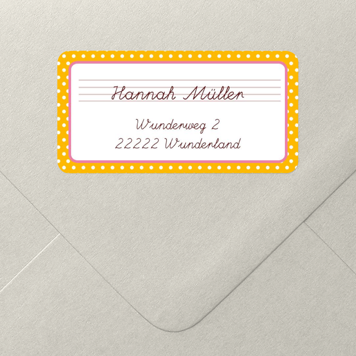 Ein wunderschöner Rahmen in gelb mit Punkten verziert diesen Adressaufkleber, speziell entwickelt für die dazugehörige Einladungskarte zur Einschulung.