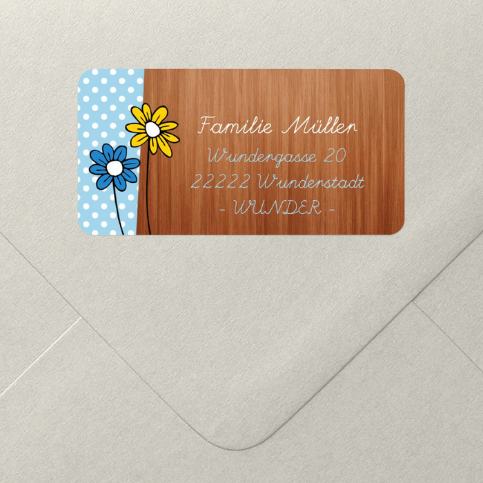 Versehen Sie Ihre Post mit einem kleinen Fenster zur Natur. Hellen Sie die Gemüter Ihrer Adressaten mit diesen schönen Adressetiketten mit jeweils einem blauen und einem gelben Blümchen auf. Erstellen Sie persönliche Adressetiketten oder welche für die ganze Familie.