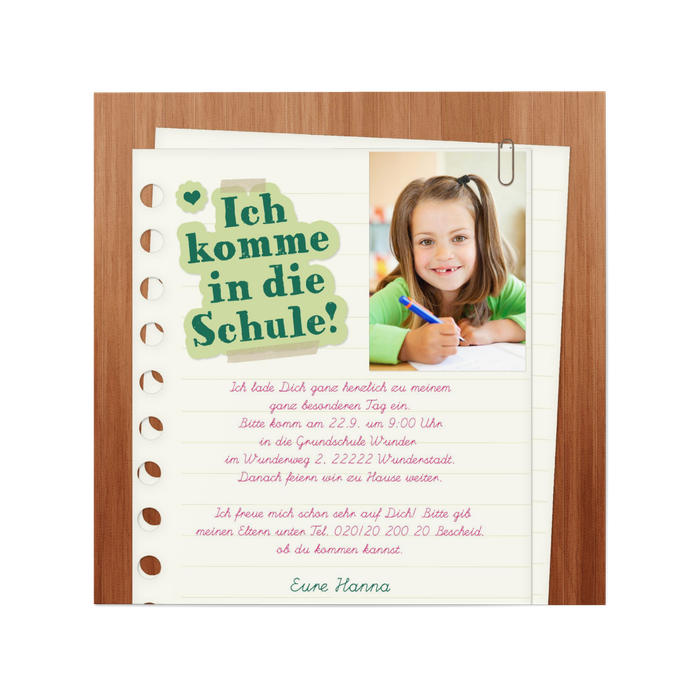 Die Einschulung steht bevor und es fehlen die passenden Einladungen. Diese Einladungskarte kündigt die allererste Klasse in grüner auffälliger Schrift in Form eines Notizbuches an.