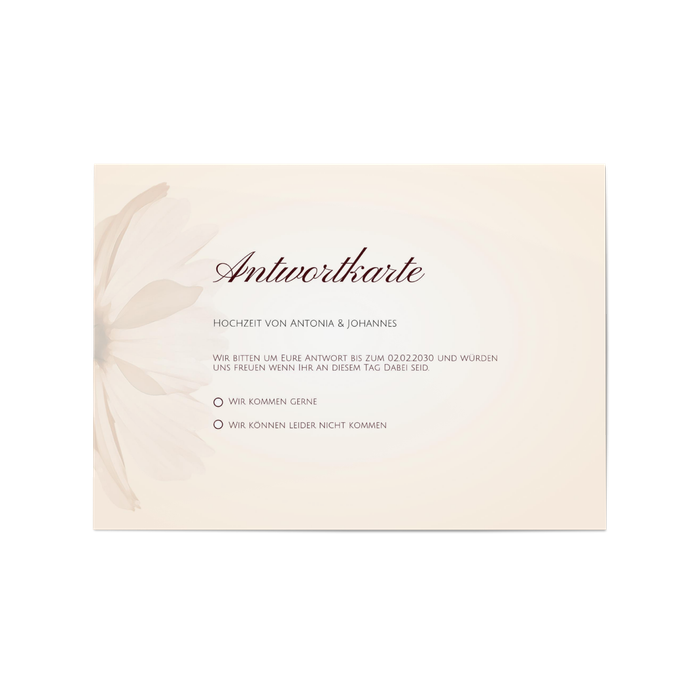 Eine Einladung zur Hochzeit soll natürlich auch beantwortet werden. Mit der Antwortkarte "Zarte Blume in Braun" können Sie diese stilvoll einfordern.
