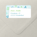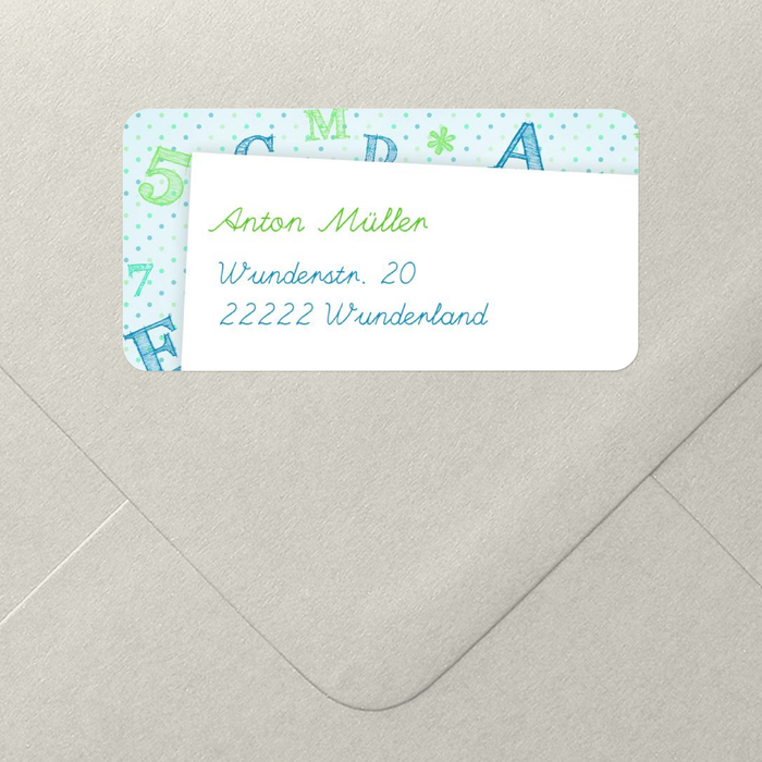 Bunte Buchstaben in Blau und Grün für einen Adressaufkleber zum Verlieben. Sparen Sie sich das Aderessenschreiben und nutzen Sie dieses Adressetikett für Ihre Einschulungskarte.