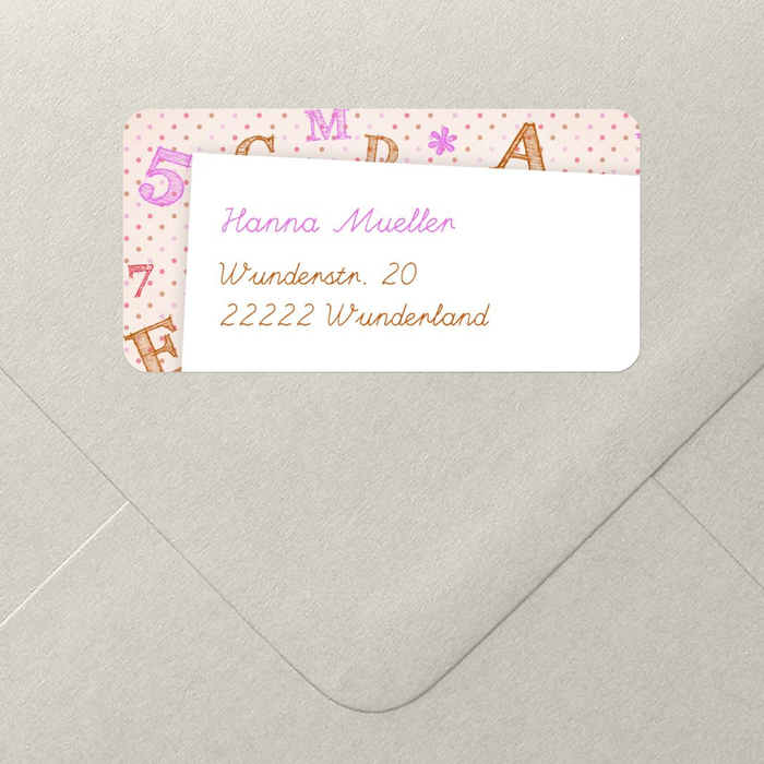 Der Adressaufkleber mit bunten Buchstaben in Lila. Wunderbar angepasst an die passende Einschulungskarte Ihrer Kleinen.