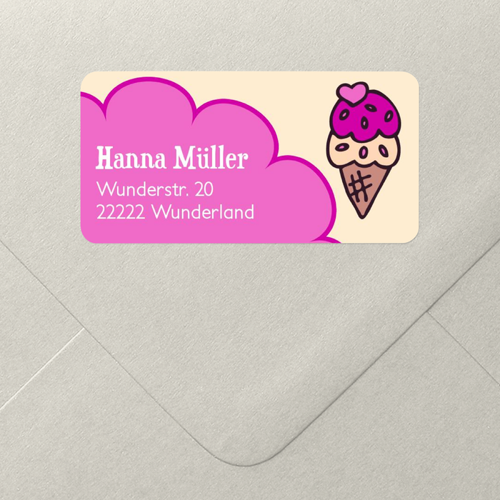 Eine Kugel Kirscheis in violett und eine Kugel Vanilleeeis, ganz verspielt zeigt sich dieses Adressetikett und kündigt die anstehende Party an. Diese Süßigkeiten versüßen Ihre Post und sind nun mal einladend, Sie können sich auf zahlreiche Gäste freuen!