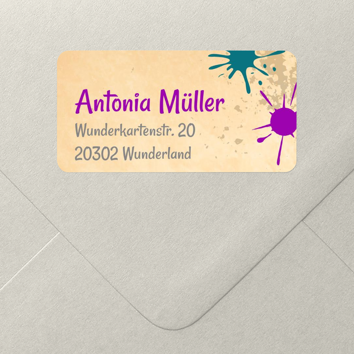 Diesen Adressaufkleber schmücken freche Farbkleckse in den Farben Lila und Türkis. Ihren Namen und die Anschrift können Sie in farblich abgestimmter Schrift einfügen. Über einen Brief mit einem solch spritzigen Adressetikett freuen sich auch die Empfänger.