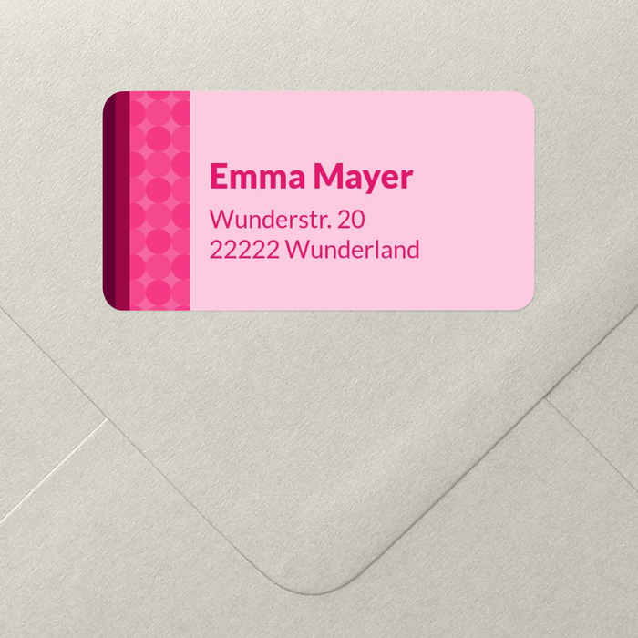 Pinke Streifen am linken Rand verzieren dieses Adressetikett. Fügen Sie in pinker Schrift Ihre Adressangaben hinzu, während diese von den Kreisen umspielt werden.