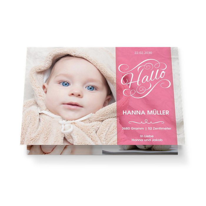 Ja Hallo, wer schaut mich denn da an? Die Karte Hallo Baby in Rosa lässt da keinen Zweifel - ein neuer Erdenbürger ist angekommen. Die stolzen Eltern können ihr Glück dank der großen Fotoflächen perfekt in Szene setzen. Aber auch für ein paar persönliche Worte ist natürlich noch genügend Platz.
