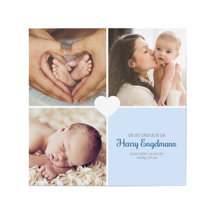 Diese wunderschöne Dankeskarte zur Geburt in ruhigem Taubenblau lässt es jeden wissen: Ihr Junge ist da! Die Karte bereitet jedem Empfänger im Nu ein glanzvolles Lächeln in's Gesicht, denn sie verkündet mit viel Platz für Fotos und Text die freudigen Neuigkeiten Ihres Glücks.
