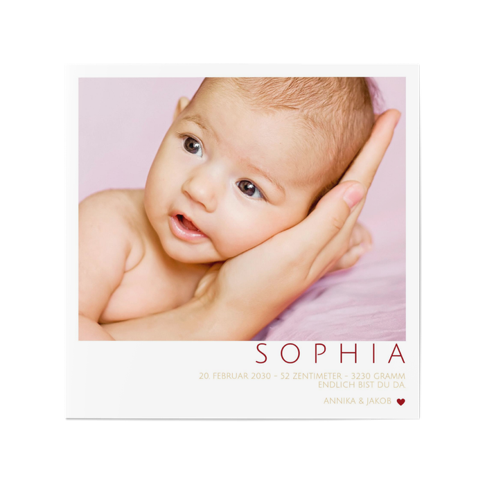 Alle werden sich über diese schlichte, aber dennoch elegante Karte freuen! Teilen Sie all Ihren Liebsten die Ankunft Ihres größten Schatzes mit der Babykarte "Rein" in kräftigem Rot und sanftem Beigeton mit, und Sie machen sicher nichts falsch.