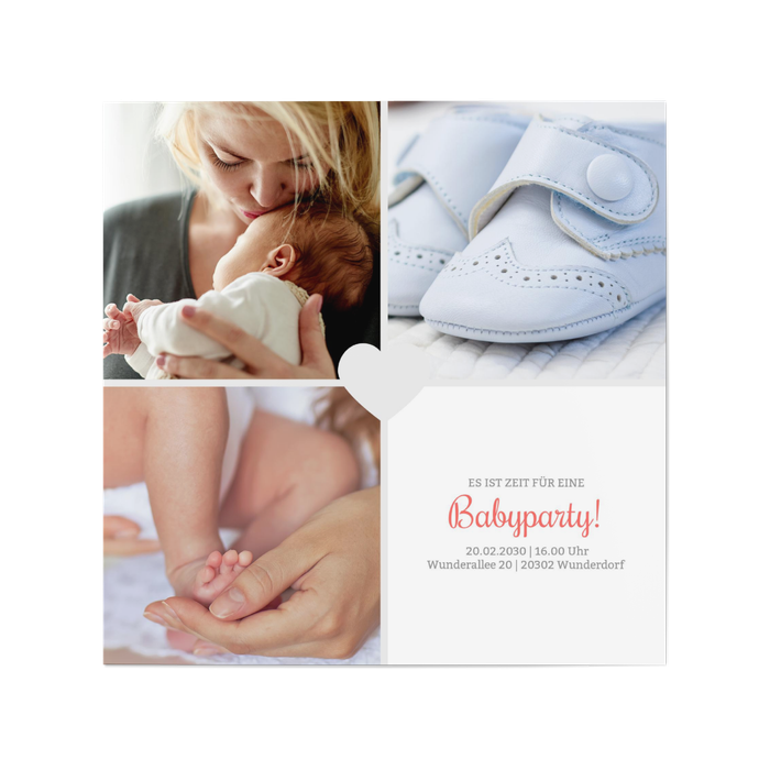 Mit der Babykarte "Herzchenparty" laden Sie alle Ihre Gäste auf stilvolle Weise zu Ihrer Babyparty ein. Die vielen großen Fotofelder bieten genügend Platz, die Empfänger schon beim Öffnen mit Ihren herzallerliebsten Babyfotos zu überraschen. Legen Sie gleich mit der Gestaltung los!