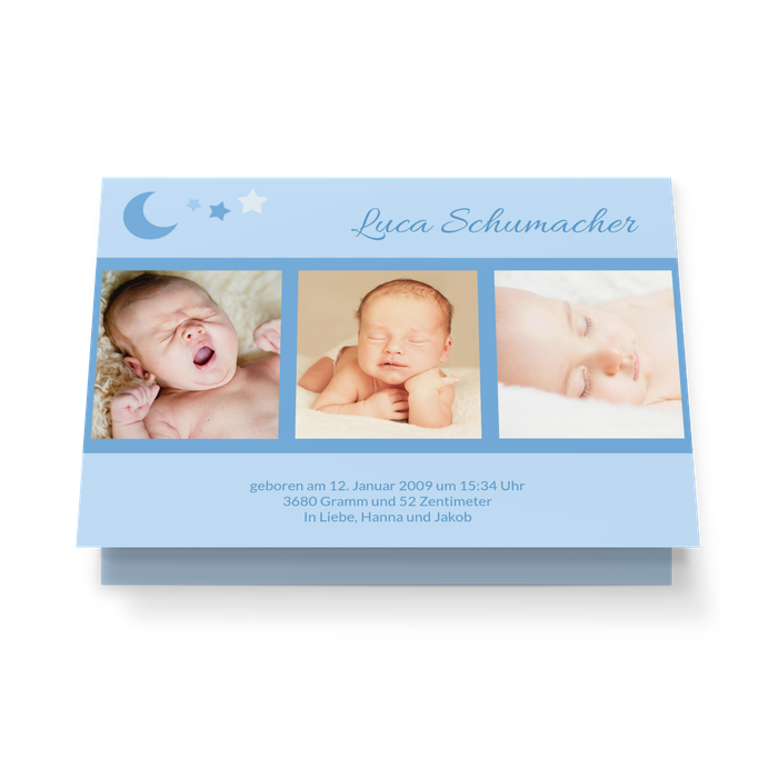 Ihr süßer kleiner Sohn hat nun endlich das Licht der Welt erblickt. Drei Bilder Ihres Schatzes finden auf dieser Foto-Geburtsanzeige Platz und erfreuen die Empfänger. Der Mond und die Sterne wachen dabei über Ihren Liebling.