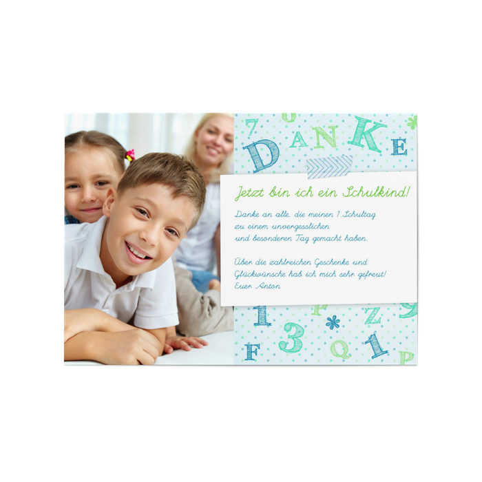 Ein Foto Ihres Kindes mit seiner Schultüte eignet sich hervorragend um allen Freund und verwandten ein kleines Erinnerungsstück in Form einer Danksagungskarte zur Einschulung mitzugeben. Mit Zahlen und Buchstaben in schönem Blau dekoriert bietet diese Dankeskarte zudem genug Raum für eine persönliche Danksagung.