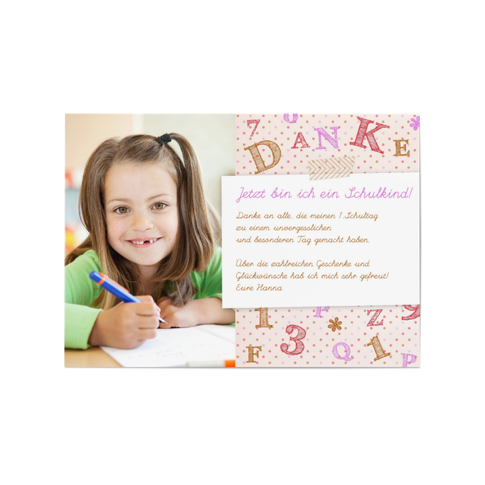 Zur Einschulung Ihres Kindes haben Sie jede Menge Glückwunschkarten erhalten? Erwidern Sie diesen Gefallen doch und schenken Sie all den Gratulanten diese Danksagung. Passende gestaltet mit bunten Stiften und Buchstaben können Sie außerdem noch ein Foto Ihres neuen Schulkindes einfügen.