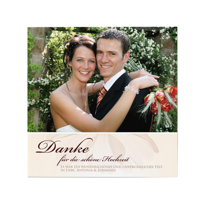 Seinen Gästen sollte man für die Glückwünsche und Geschenke zur Hochzeit danken. Mit unserer Dankeskarte zur Hochzeit "Zarte Blume in Braun" treffen Sie garantiert jeden Nerv.