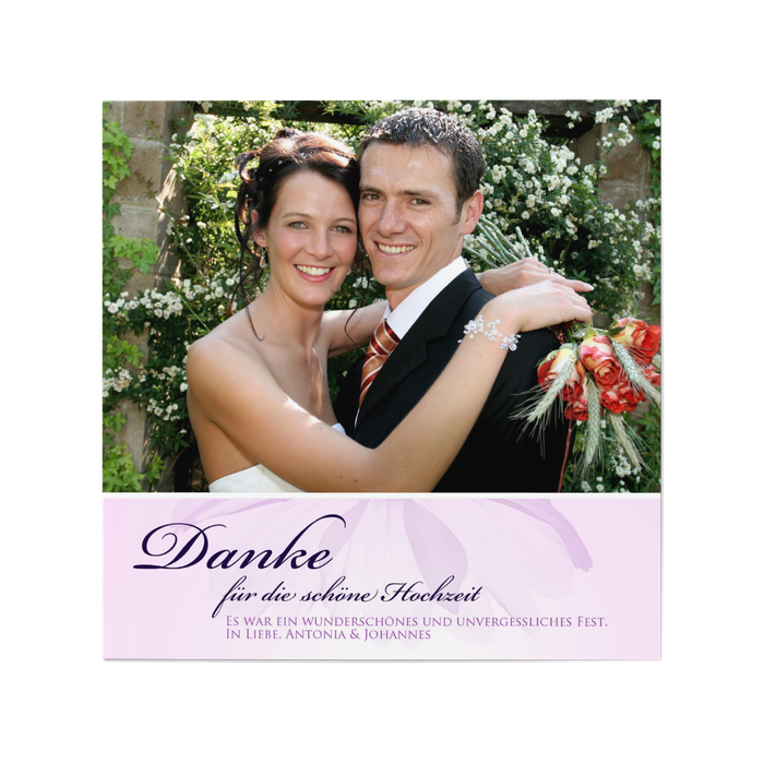 Eine Dankeskarte ist nicht zu jedem Anlass notwendig. Allerdings nahezu obligatorisch zur Hochzeit. Bei allen Gästen sollte man sich für das Erscheinen und die entgegengebrachten Glückwünsche bedanken. Mit unserer Dankeskarte zur Hochzeit „Zarte Blume in Lila“ finden Sie die optimalen Worte.