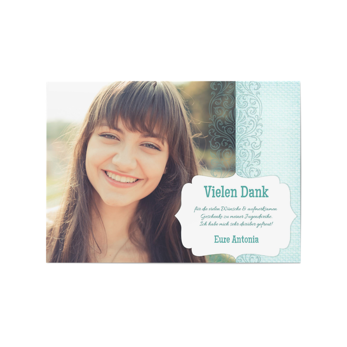 Ein festlicher Rahmen liegt auf einem Hintergrund aus einem zarten, gewebten Muster in hellem Türkis. Genau richtig, um sich für die lieben Worte und Geschenke bei allen zu bedanken, die Ihre Jugendweihe mit Ihnen gefeiert haben!