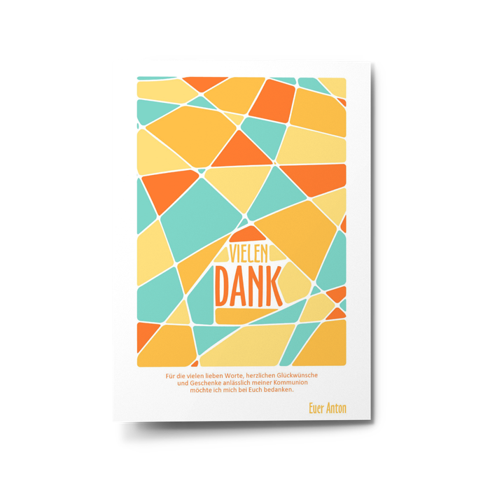 Frisch, jung und modern zeigt sich diese Dankeskarte, die Ihren Kommunionsgästen ganz sicher gefallen wird. Die ansprechende Kirchenglas-Optik im Retro-Stil ist ein wahrer Hingucker und wird zusammen mit Ihrem Lieblingsfoto und Ihrem persönlichen Text zu einem Unikat, das in Erinnerung bleiben wird.