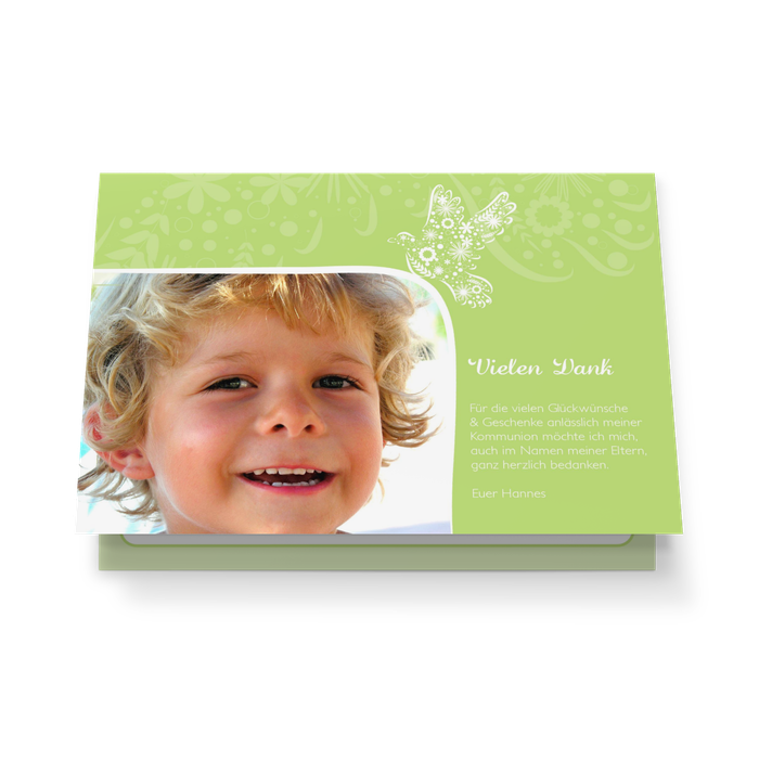 Ein helles Grasgrün bildet den Untergrund, auf dem ein kleines Frühlingstäubchen, zusammengesetzt aus hübschen Blüten und Blumenelementen landet. Es bringt ein paar liebe Dankesworte und ein Erinnerungsfoto des glücklichen Kommunionkindes mit sich. Danke für all die vielen Glückwünsche und aufmerksamen Geschenke! Danke an alle Gäste, die anwesend waren, und diesen Tag zu etwas besonderem machten. Nun haben sie ein ganz persönliches Andenken an das schöne Fest.