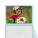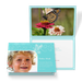 Auf einem Untergrund in Petrol fliegt ein Täubchen herein. Es ist geschaffen aus hübschen Blüten, und bringt ein Foto des fröhlichen Kommunionkindes mit. Ein paar persönliche Dankesworte bereiten sicher jedem der Gäste Freude, die mit vielen Glückwünschen und aufmerksamen Geschenken zum Fest kamen. Für sie ist diese Karte sicher ein hübsches Andenken an den gelungenen Tag.