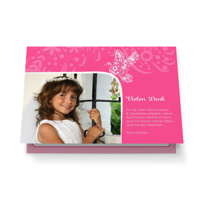 Durch Ihre individuelle Foto- und Textzusammenstellung erhalten Ihre Liebsten ein ungewöhnliches, künstlerisch wertvolles Dankeschön und obendrein ein schön anzuschauendes, bleibendes Stück Erinnerung. Das mädchengerechte Design dieser flatternden Danksagungskarte ist außerdem wie geschaffen für flügge werdende „Frühlingstäubchen“!