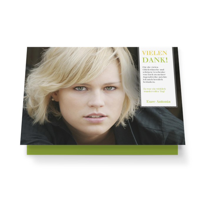 Nicht nur die Jugendweihe, sondern auch die Dankeskarte sollte etwas Besonderes sein. Eine Dankeskarte in Grün in Kombination mit einem netten Spruch übermittelt Glück und Zufriedenheit.