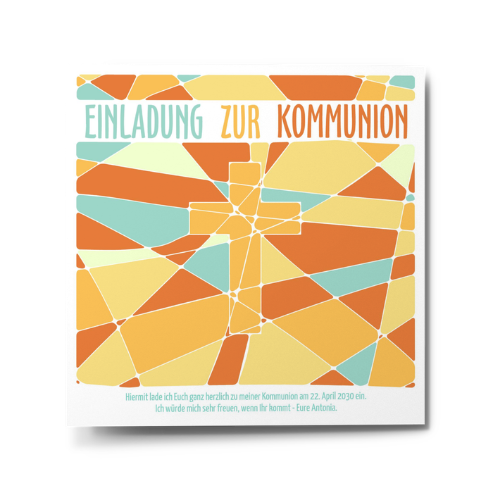 Mit dem Kartenmotiv „Kirchenglas in Retro“ liegen Sie mit Ihrer Einladung zur Kommunion voll am Puls der Zeit. Ungezwungen und modern lotsen Sie Ihre Liebsten auf Ihre Weise und mit Ihren Worten zu den Feierlichkeiten. Teilen Sie Ihren Gästen in den entsprechenden Textfeldern den Tagesablauf mit und machen Sie mit ein paar gelungenen Schnappschüssen Lust auf einen geselligen Tag sowie ein bedeutendes, christliches Ereignis.