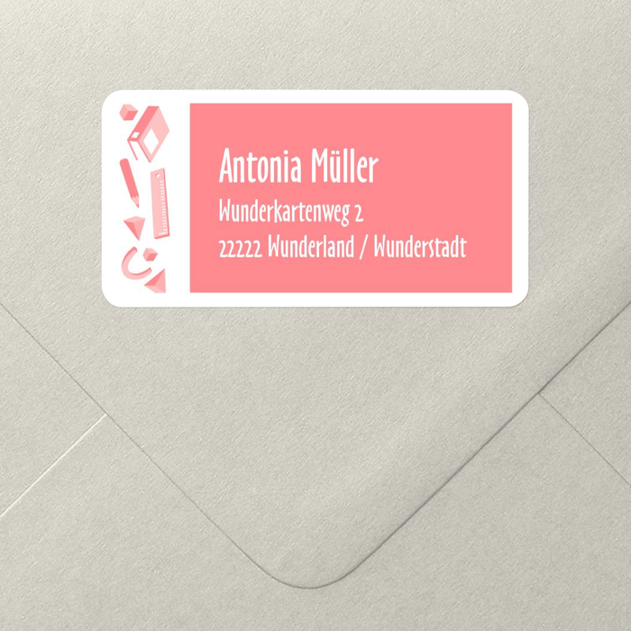 Rote Utensilien auf weißem Hintergrund mit nebenstehender Absenderadresse. Eine ansprechende Kombination aus Funktionälität und Ästhetik auf diesem Adressaufkleber für die Einladung zur Einschulung.