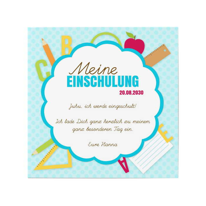 Der 1. Schultag Ihres Kindes steht vor der Tür – wie aufregend! Damit dieser Tag ein gelungenes Fest wird, laden Sie Ihre Familie und Freunde mit der fröhlichen Wunderkarte Bunte Sachen in Türkis ein. Setzen Sie einfach einige Bilder Ihres Kinder ein und los geht's.