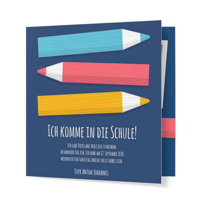 Die kunterbunte Wunderkarte Bunte Stifte in Blau macht Lust auf die Schule. Und das nicht nur bei Ihrem Kind, sondern auch bei allen Verwandten und Freunden, die Sie einladen möchten. So macht der Schulstart doch gleich viel mehr Spaß!