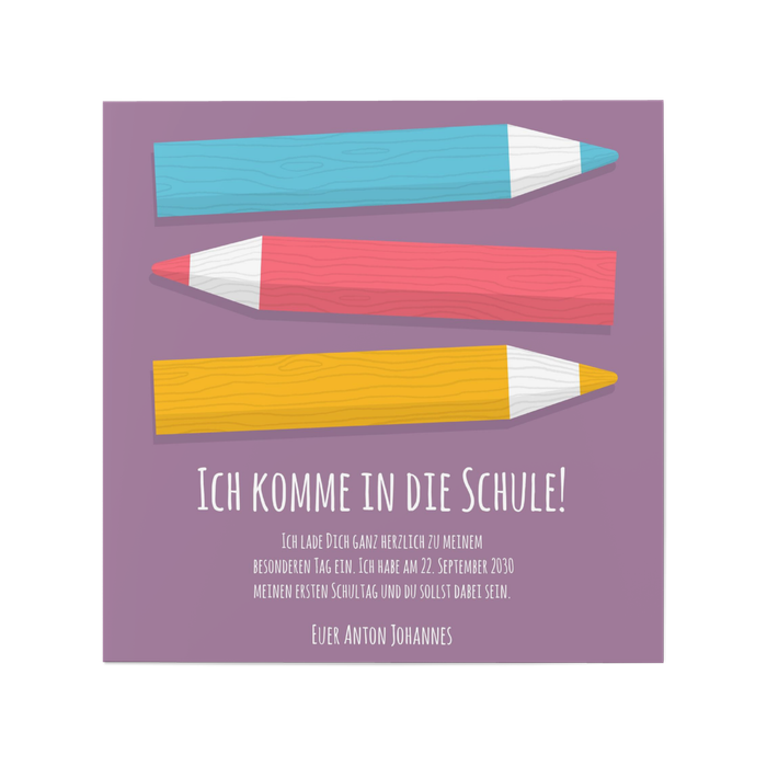 Schule – ich komme! Ihr Kind wird sich über die fröhlich gestaltete Wunderkarte Bunte Stifte in Lila ebenso freuen wie Ihre Familie, die Sie zu diesem wichtigen Ereignis einladen möchten. Fügen Sie noch einige schöne Bilder ein und dann direkt zur Post damit.