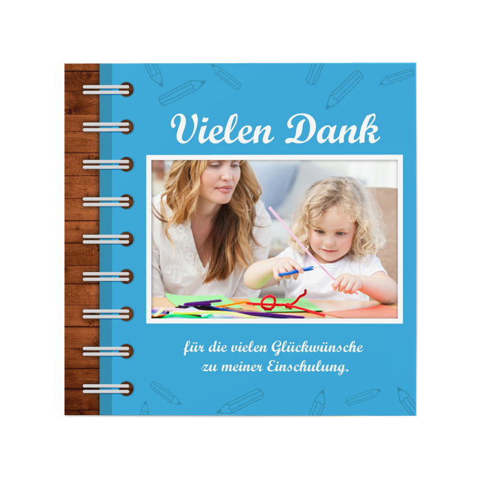 Betrachten Sie dieses besondere Notizbuch in Blau, welches eigentlich gar keines ist. Es handelt sich hierbei nämlich um eine geschickt verpackte Dankeskarte zur Einschulung.