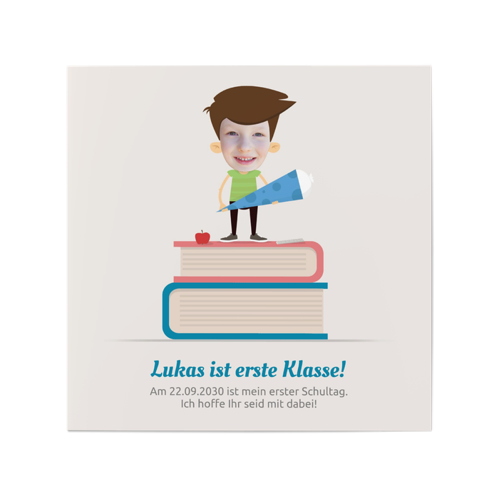 Einladungskarten Einschulung 'Jungen auf Bücherstapel'