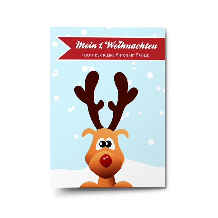 Speziell für unsere ganz kleinen Weihnachtsfans und deren Eltern haben wir diese verspielte Weihnachtskarte in Hellblau im Programm. Das lustige Rentier mit der roten Nase ist ein echter Hingucker. Auf der Klappkarte können Sie außerdem Ihre liebsten Fotos und persönlichen Grußbotschaften verewigen. Zum ersten Weihnachtsfest alles Gute!