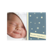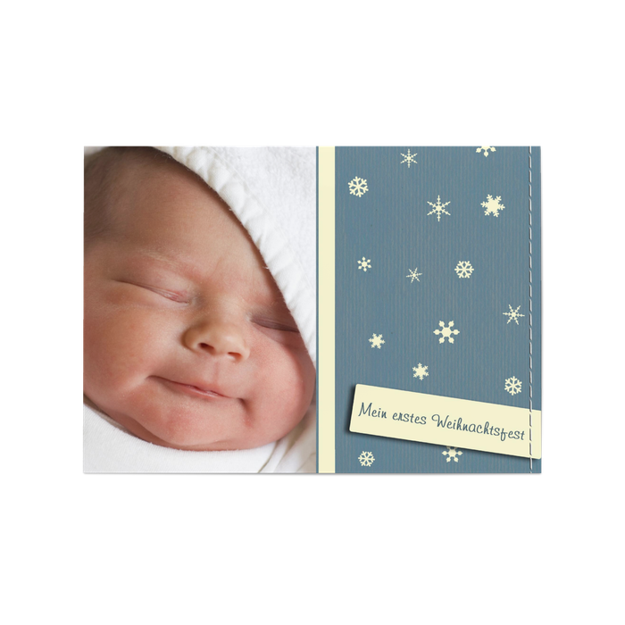 Das erste Weihnachten für Ihr Baby ist für Sie ein besonderes Ereignis, das sich auch auf den Weihnachtskarten wiederfinden soll. Die ersten Schneeflöckchen legen sich sanft auf das blaue Papier nieder während ein Bild Ihres Schatzes auf der linken Seite der Karte Platz findet.