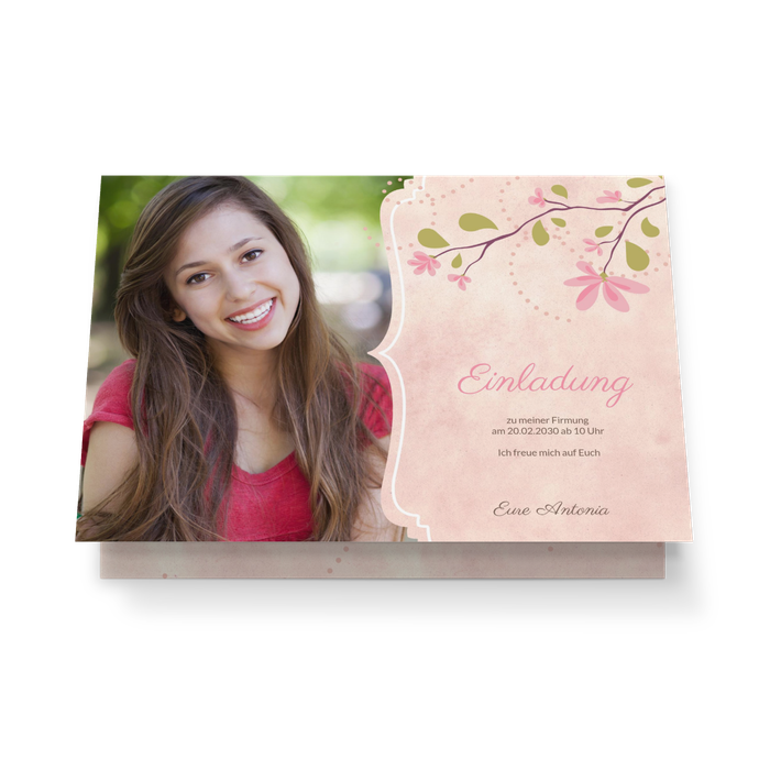 Eine tolle Einladungskarte extra für Eure Firmung! Wenn Ihr es farbenfroh und besonders rosa mögt, ist unsere Karte mit dem schönen Magnolienzweig und den zurückhaltenden Pastelltönen genau das richtige für Euch! Verschönert die Karte mit Euren Fotos und feiert eine unvergessliche Firmung!