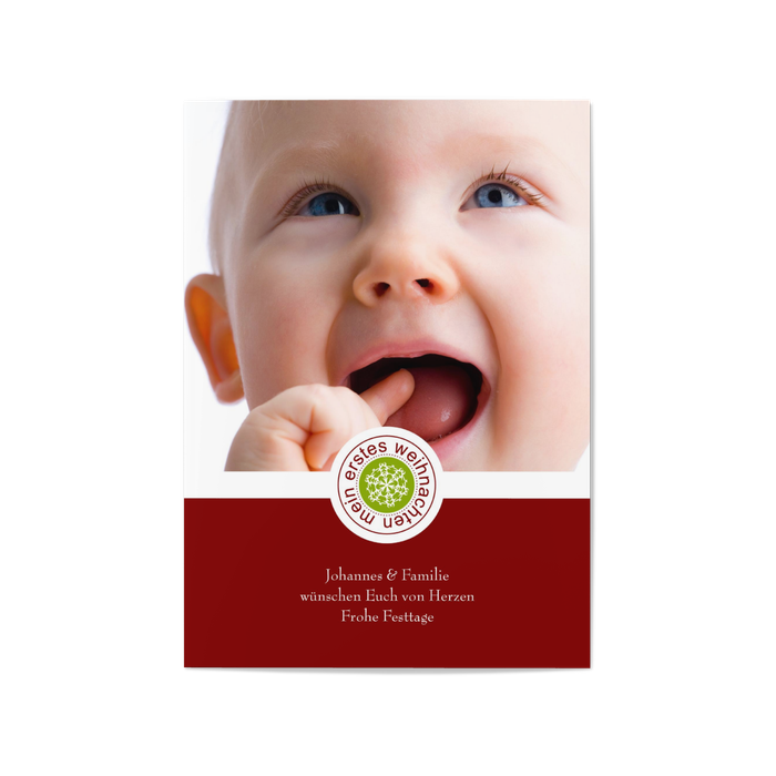 Ein kleiner Stempel teilt Ihren Lieben mit, dass Ihr Baby in diesem Jahr das erste Weihnachten feiert. Ein schönes Bild Ihres Lieblings können Sie über den Weihnachtsgrüßen auf weinrotem Hintergrund platzieren.