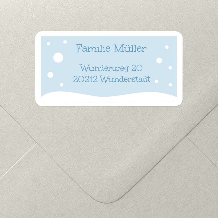 Die Schneeflöckchen in der hellblauen Winterlandschaft bilden den idealen Hintergrund für Ihre weihnachtlichen Adressaufkleber. Tragen Sie einfach Ihren Namen und Adresse ein und verschönern Sie die Umschläge Ihrer Weihnachtsgrüße mit einem echten Blickfang. Frohe Weihnachten!