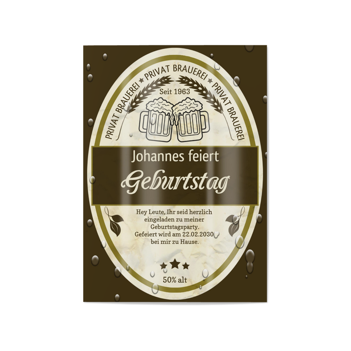 Das klassische Bieretikett in Braun. Diese Einladungskarte ist ebenso ungewöhnlich wie humorvoll und sorgt sofort für ein Maximum an Aufmerksamkeit. Schnelle Zusagen zur Party sind mit dieser Karte garantiert! Neben Braun ist die Einladungskarte zum 50. Geburtstag auch in Grün und Gold verfügbar.