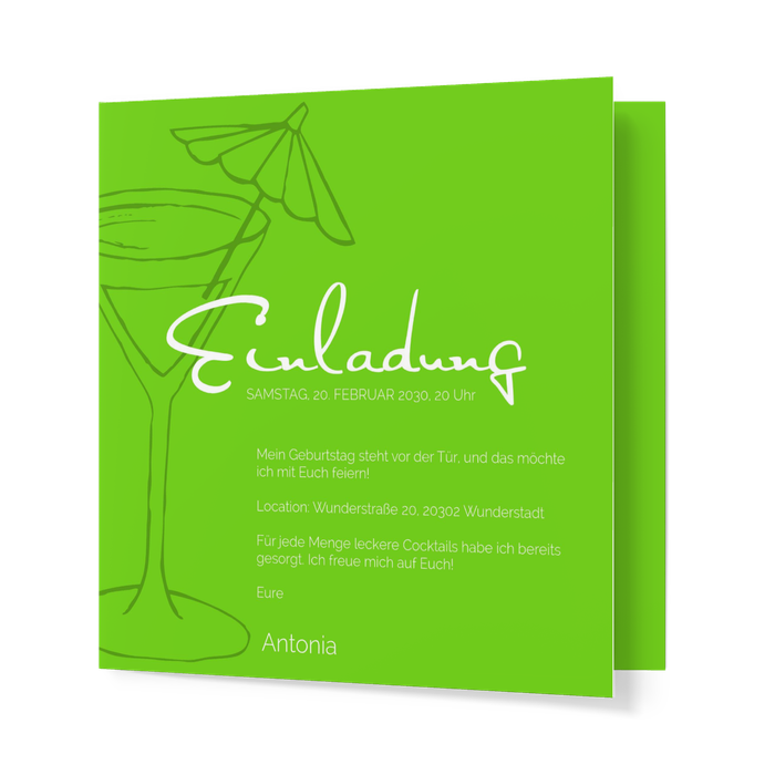 Die Vorbereitungen zur Party des Jahres laufen auf Hochtouren, Ihre Party ist so gut wie fertig organisiert und die Cocktails warten nur darauf, auch von Ihren Freunden und Lieben getrunken zu werden. Diese grünen Einladungen aus dem Hause Wunderkarten.de geben Ihnen die Möglichkeit, Ihre Gäste stilsicher zu Ihrem Geburtstag einzuladen!