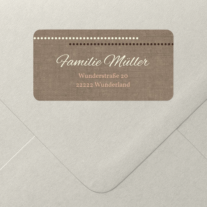 Persönliche Adressaufkleber kann man nie genug besitzen. Schnell und unkompliziert geben Sie alle notwendigen Daten ein und haben dadurch immer ausreichend Adressaufkleber im Haus. Unsere gepunkteten Linien in Schokobraun lassen sich auch noch nach Weihnachten benutzen, da dieses Motiv nicht nur speziell auf das Weihnachtsfest ausgerichtet ist.