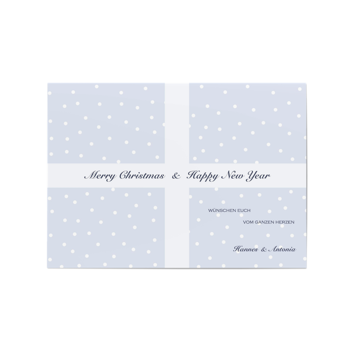 Merry Christmas and Happy New Year! Diese Karte mit winterlichem Geschenkmotiv in Weiß und Hellblau steigert die Vorfreude auf den 4. Advent. Rechts unten können Sie Ihre persönliche Grußbotschaft an Ihre Lieben einfügen. Für eine besondere Freude zu einer ganz besonderen Jahreszeit!