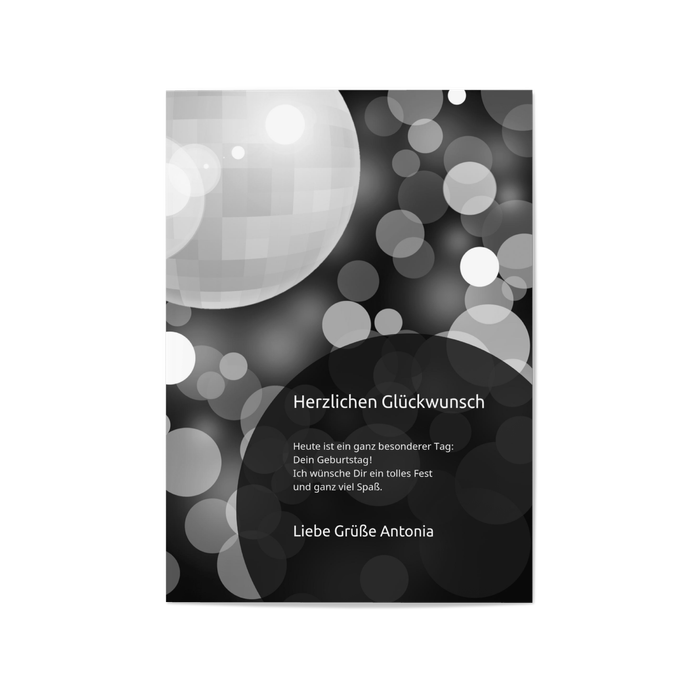 Cooles Discofeeling in Monochrom-Optik! So präsentiert sich die stylische Glückwunschkarte Partytime! Discokugel in Silber. Fügen Sie einfach Ihre Grüße und Wünsche in die vorgesehenen Textfelder ein und dann ab auf die Tanzfläche. Licht aus – Spot an!