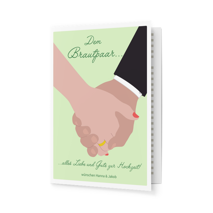 Ein Hoch auf das glückliche Brautpaar! Mit der geschmackvollen Glückwunschkarte Hände in Grün überraschen Sie Braut und Bräutigam mit einer individuellen Karte voller guter Wünsche und Grüße. Eine tolle Idee für den Start in das gemeinsame Leben.