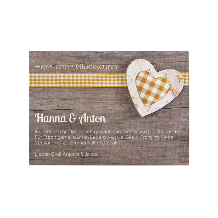 So kommt Herz-an-Herz-Gefühl auf! Die zauberhafte Wunderkarte Herz aus Holz in Ocker versprüht ihren ganz eigenen rustikalen Charme. Nutzen Sie die Karte, um einem Brautpaar zu gratulieren, Ihren Partner zu überraschen oder Geburtstagsgrüße zu übermitteln.